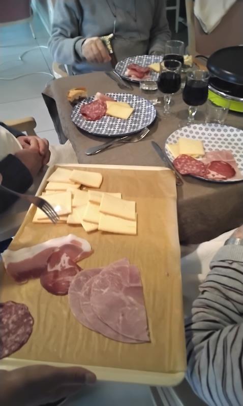 Dans une ambiance conviviale et pleine de bonne humeur, chacun a pu participer à la mise en place de la table et à l’organisation du repas. Les plateaux étaient déjà prêts, le fromage soigneusement disposé, la charcuterie installée, les pommes de terre bien chaudes… Il ne restait plus qu’à profiter. Très vite, l’odeur du fromage fondu a rempli la pièce, ouvrant l’appétit et faisant naître de nombreux sourires.