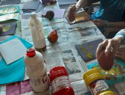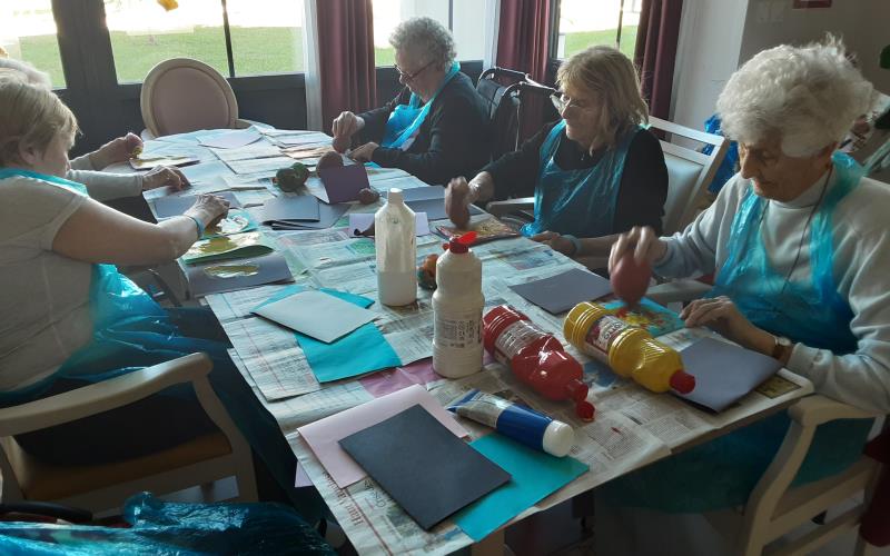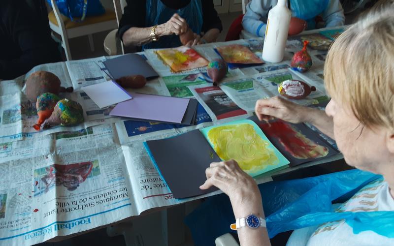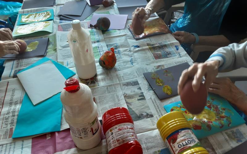 Les résidents réalisent une expression avec une consigne et une technique simple : avec un ballon de baudruche, vous devez prendre de la peinture et recouvrir le support. Cette technique fait appel à la motricité fine.