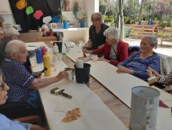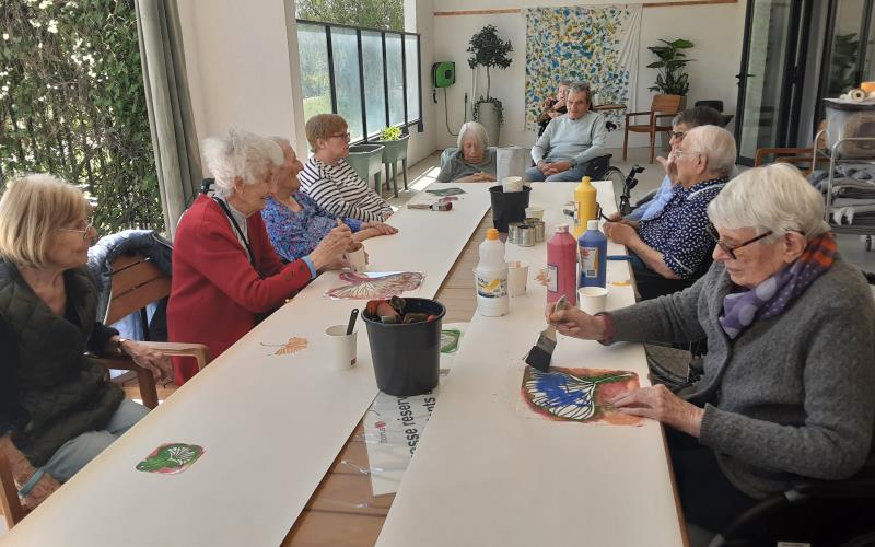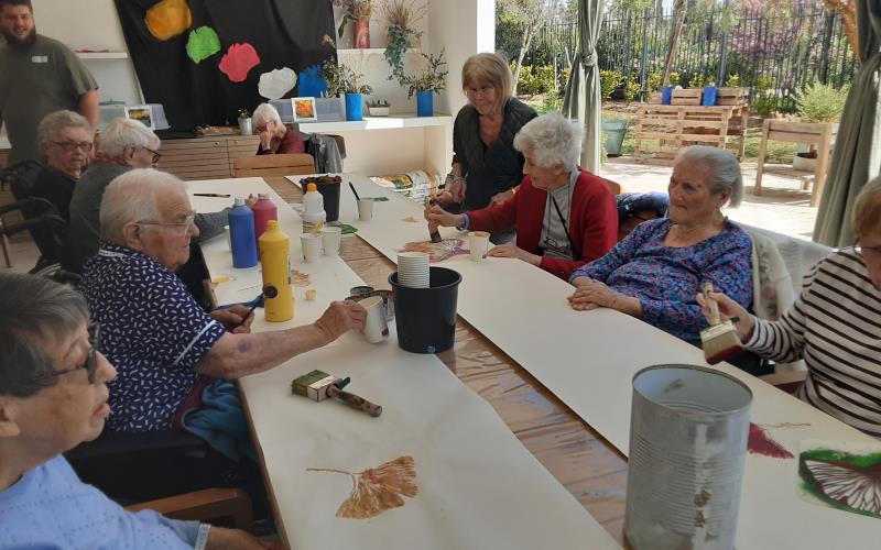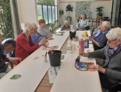 Les résidents réalisent une expression, sur un support blanc, avec une consigne et une technique simple, réalisation accompagnée de pochoirs, permettant à chaque participant de couvrir le support et s’échanger les pinceaux.