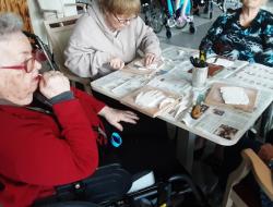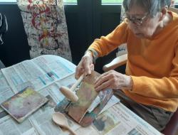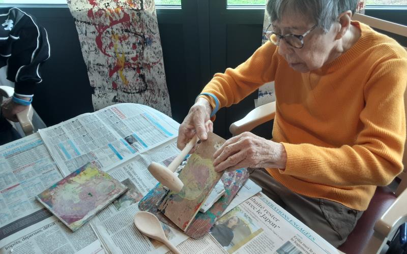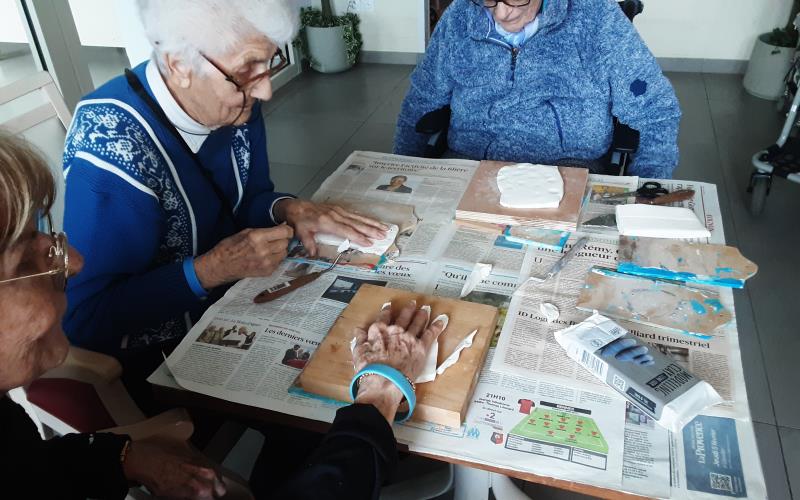 Avec les différents outils installés sur une table, chaque résident prend contact avec l'argile, puis prend connaissance de la consigne pour stimuler la réalisation d'une expression.