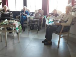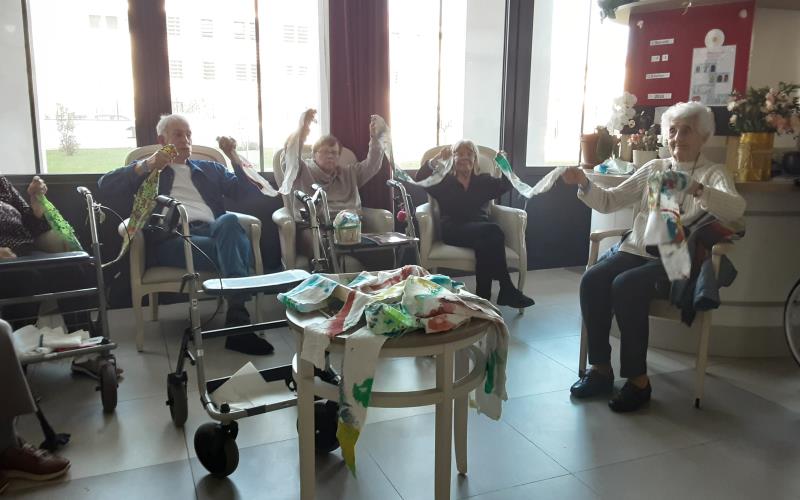 La séance débute par l'installation cercle des résidents puis par l'écoute musicale en rituel d'accueil, et enfin, la gestuelle intervient, favorisant le travail sur les deux hémisphères. Action sur le cognitif, le rythme et par l'écoute de la musique, la danse devient un langage universel comme une grammaire dont le corps devient le vocabulaire. Le vocabulaire est enrichi avec l’apport de foulards, créant ainsi une dynamique à la chorégraphie.