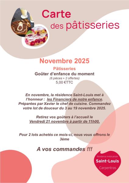 Passez votre commande auprès du secrétariat du 3 au 19 Novembre et retirez votre goûter d'enfance le Vendredi 21 novembre à partir de 11h.