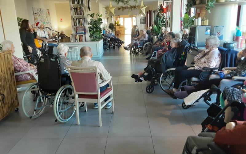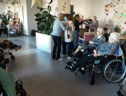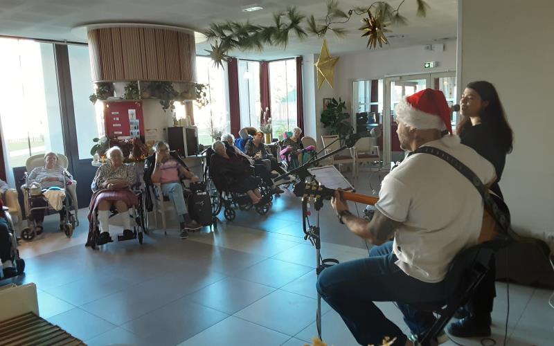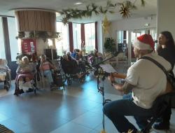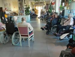 En début d’après-midi, c’est le duo de chanteurs, Adonis et Théa, qui orchestrait pour la plus grande joie des résidents, de l’UVP et des familles. Ce concert s’est déroulé dans le grand salon permettant ainsi d’accueillir le plus grand nombre. Les résidents ont mis en pratique l’atelier danse assise durant cette intervention.