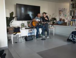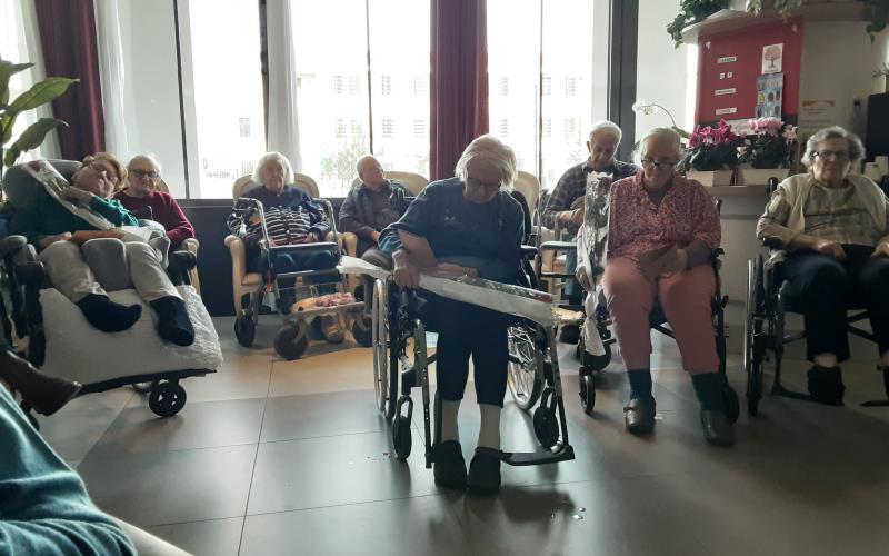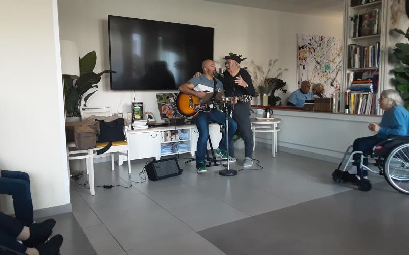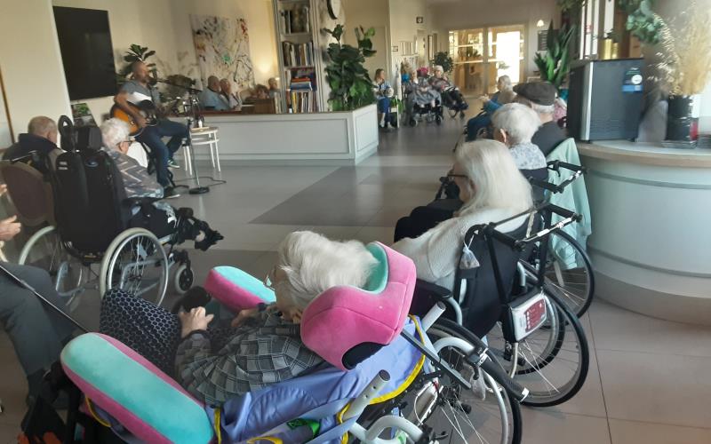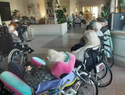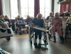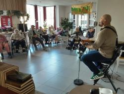 En début d’après-midi c’est Adonis musique, chanteur accompagné de sa guitare sèche qui orchestrait pour la plus grande joie des résidents et des familles ; ce concert s’est déroulé dans le grand salon permettant ainsi d’accueillir le plus grand nombre. Les résidents ont mis en pratique l’atelier danse assise durant cette intervention.