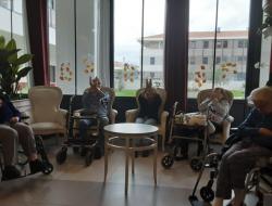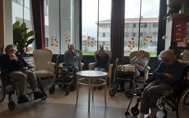 En 1er lieu : Installation en cercle des résidents, écoute musicale en rituel d'accueil, puis la gestuelle intervient ; un travail débute sur les deux hémisphères, cognitif, rythme et musique et la danse devient langage universel comme une grammaire dont le corps devient le vocabulaire.