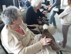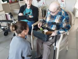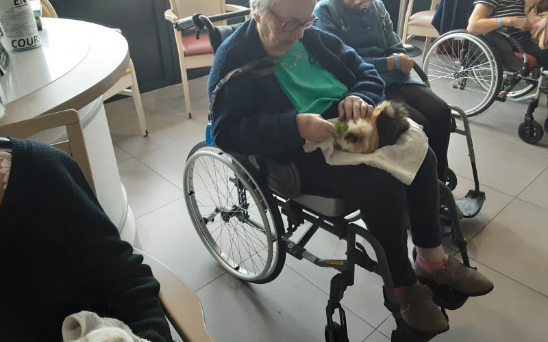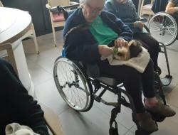 L’animal sert de médiateur entre le l’accompagnant et le résident, favorisant ainsi la conversation. Et aussi parfois accompagné avec des enfants.