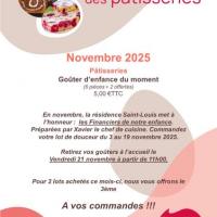 Publiée le 28/10/2025Bonjour, Nous reprenons ce mois ci les goûters d'enfance avec les fameux " financiers" de notre Chef. 2 sachets achetés au prix de 5 euros, le 3ème est offert ! Passez votre commande auprès du secrétariat du 3 au 19 Novembre et retirez votre goûter d [...] Lire la suite