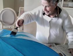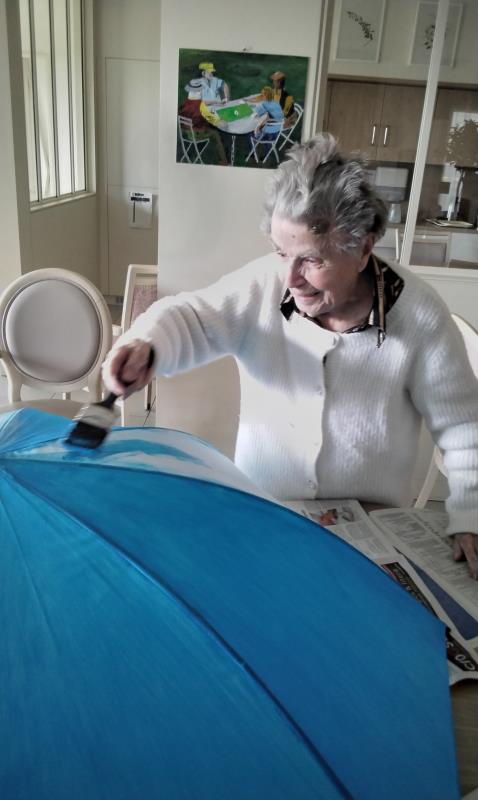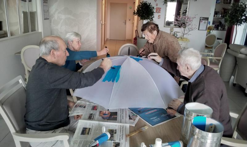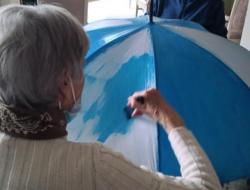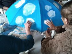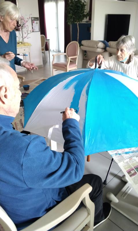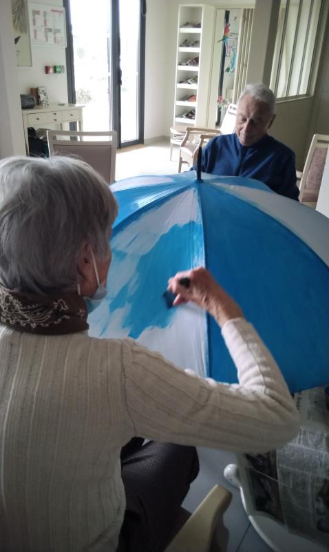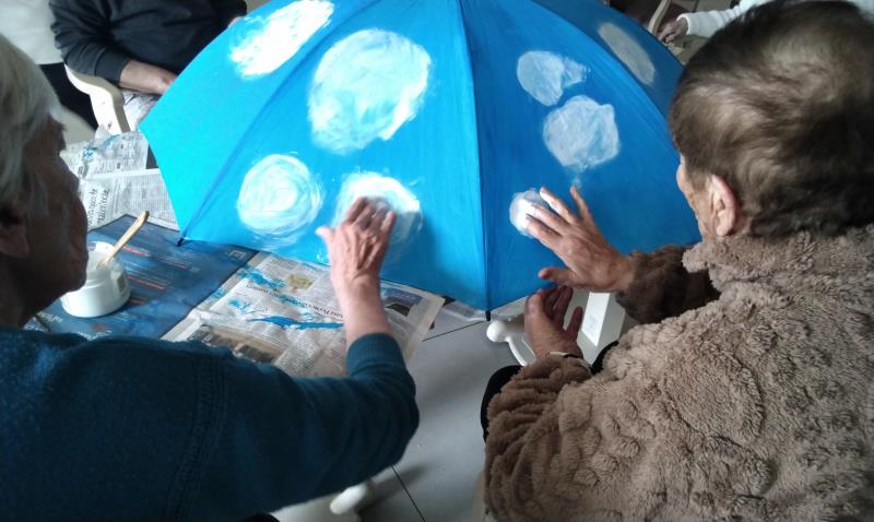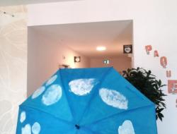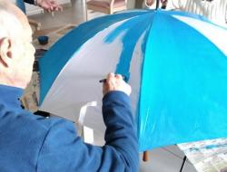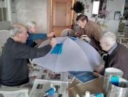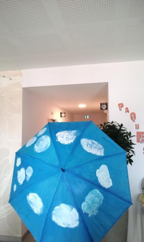L’atelier a été entièrement réalisé par un groupe d’usagers de l’accueil de jour, qui a travaillé ensemble à la création d’un projet original : la décoration d’un parapluie. Le fond a été peint en bleu, avec des nuages blancs, évoquant l’imaginaire, la légèreté et le monde des rêves. Chacun a pu apporter sa touche personnelle tout en contribuant à une œuvre collective.