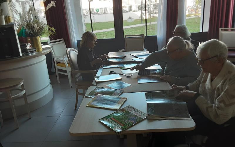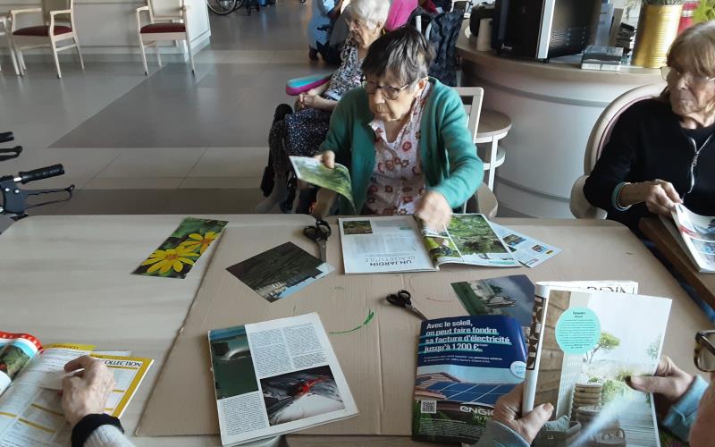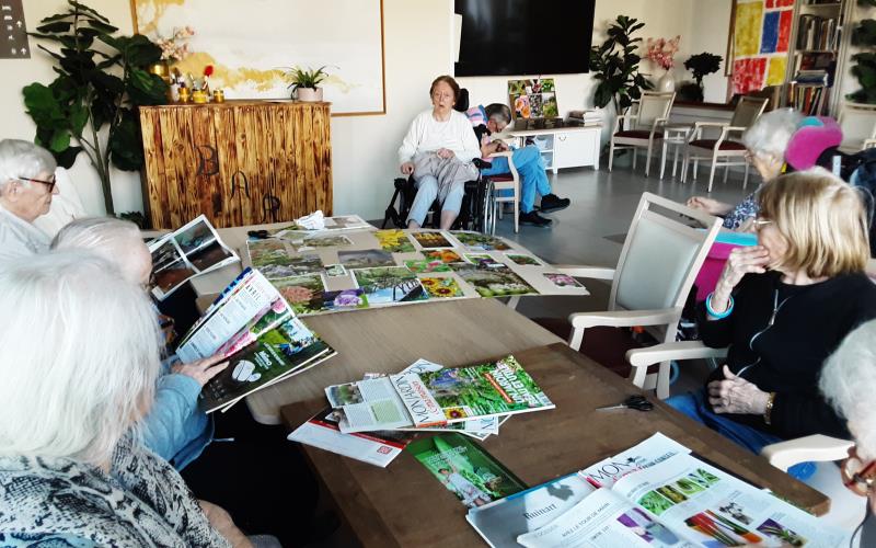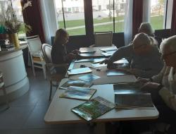 Plusieurs dizaines de photos anciennes sur la nature, les jardins, les fleurs, sont disposées sur une table. Les résidents choisissent deux photos qui leur évoquent un souvenir ou quelque chose qui leur ressemble, le temps du choix est libre et se fait en silence.