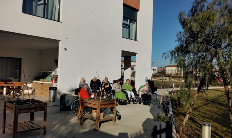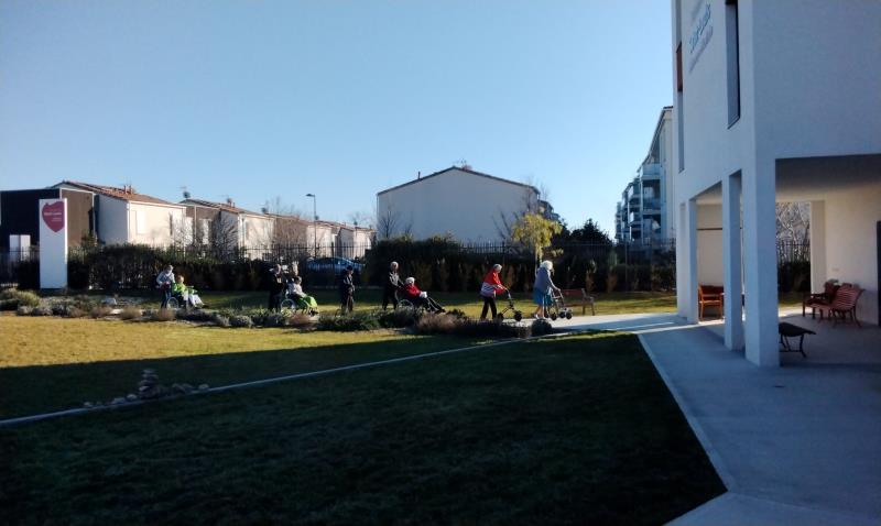 Petite promenade thérapeutique avec les résidents de l'EHPAD et de l'acceuil de jour sous le soleil dans le jardin. C'est un lieu propice à l'évocation d'évènements passés, au jardinage, au lieu de culture, un véritable lieu de plaisir.