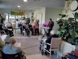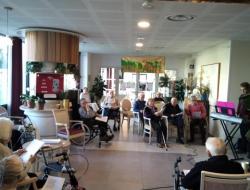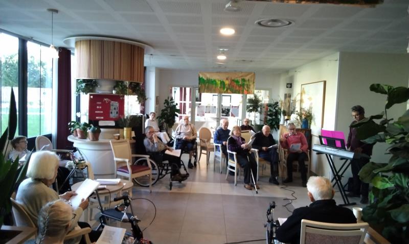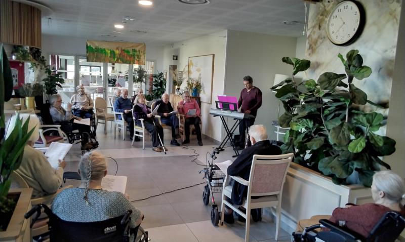 Chaque mardi, les usagers de l’accueil de jour se réunissent au sein de la résidence pour participer à la chorale hebdomadaire. Ce rendez-vous, devenu un véritable rituel, se déroule toujours dans une ambiance chaleureuse et conviviale.
